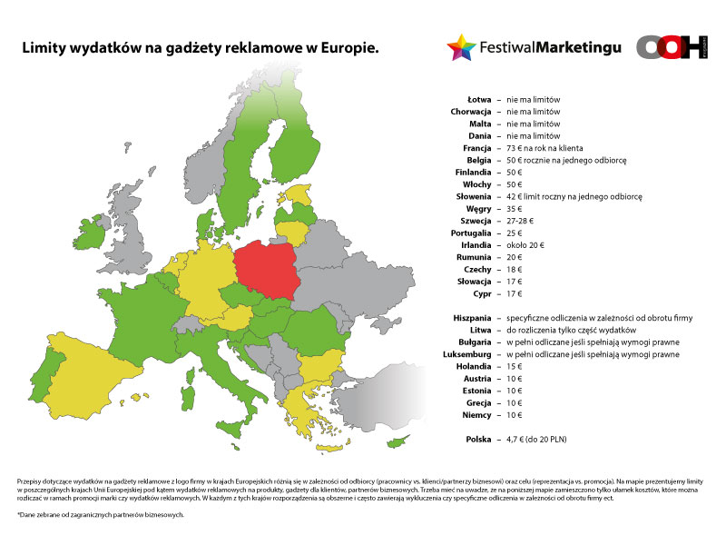 Najostrzejsze przepisy obowiązują w Polsce, gdzie maksymalna wartość gadżetu reklamowego wynosi jedynie 20 złotych (ok. 4,7 euro).