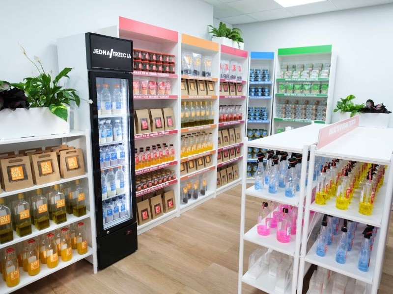 W drugim etapie, w połowie listopada, ruszyło serce kampanii – przestrzeń edukacyjna „Jedna/Trzecia”. Wnętrze imitowało prawdziwy sklep, ale zaprojektowany tak, by klienci odczuli drastyczną różnicę w sile nabywczej. Na półkach czekały atrapy produktów – grochu, oliwy czy proszku do prania – wypełnione tylko w 1/3 objętości. Etykiety zamiast składu prezentowały dane o konieczności oszczędzania. Odwiedzający otrzymywali też materiały edukacyjne i limitowane torby.
