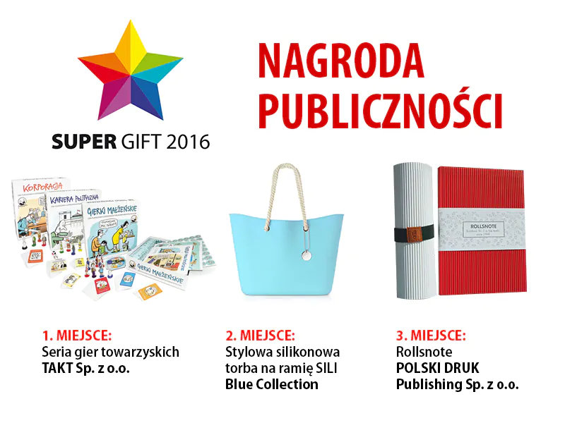 Najwięcej głosów publiczności zdobyła seria gier towarzyskich z autorskimi rysunkami Andrzeja Mleczki, którą w swojej ofercie posiada firma TAKT. Drugie miejsce otrzymała stylowa torba silikonowa od Blue Collection, a 3. miejsce przypadło firmie POLSKI DRUK Publishing Sp. z o.o., która zaprezentowała Rollsnote classic – notes formatu A5.