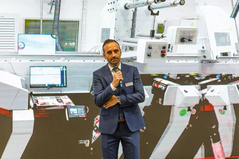 Phil Baldwin przedstawił ideę wprowadzenia tego modelu do oferty, podkreślając, że bazuje ona na sprawdzonej platformie maszyn fleksograficznych Evolution Series. Ruud Bos – DP OEM Manager Europe w firmie Domino przedstawił „serce” maszyny – moduł inkjetowy V16610i, umożliwiający drukowanie z szerszym gamutem kolorystycznym (CMYKOV + W). Z kolei Marco Ordung – Product Manager w firmie Kurz opowiedział o module Distorun, przeznaczonym do uszlachetniania wydruków.