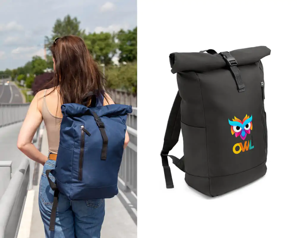 Zwijana przegroda to coś więcej niż element designu – pozwala z łatwością zwiększyć pojemność plecaka. Posiada przegrodę oraz przednią kieszeń z zapięciem na zamek, dwie boczne kieszenie oraz zapięcie na klamrę. Wykonany z poliestru z recyklingu.
