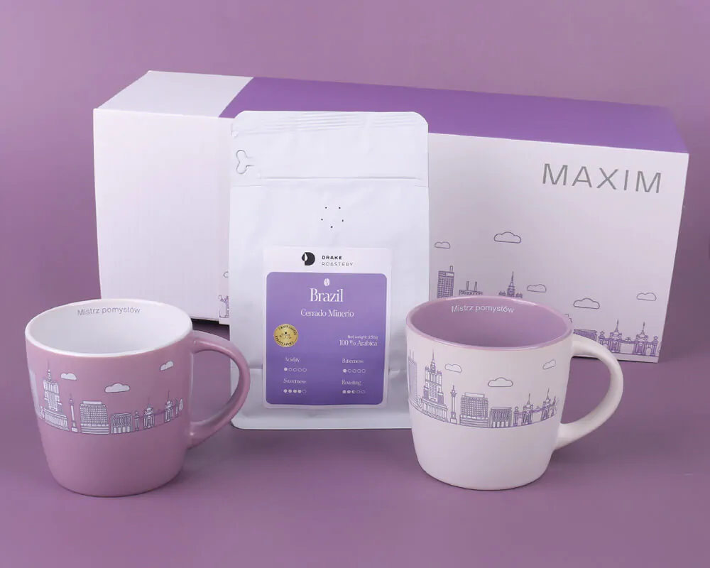 Kolorowy zestaw dwóch zachwycających pastelowych kubków Handy, kusi satynową w dotyku powierzchnią i ergonomicznym kształtem. Uzupełnieniem setu jest aromatyczna kawa. Zestaw pakowany w dedykowane opakowanie z elegancką personalizowaną obwolutą.