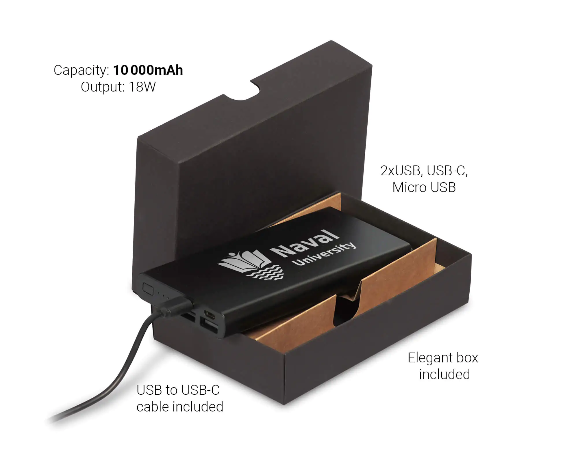 Power Bank o pojemności 10000 mAh i dużej powierzchni do znakowania. Wyposażony w 4 porty: 2xUSB, USB-C, Micro USB, funkcję szybkiego ładowania 18W i sygnalizację LED. Ozdobne opakowanie GRATIS. Dostępny w 24h, w atrakcyjnej cenie z magazynu w Polsce