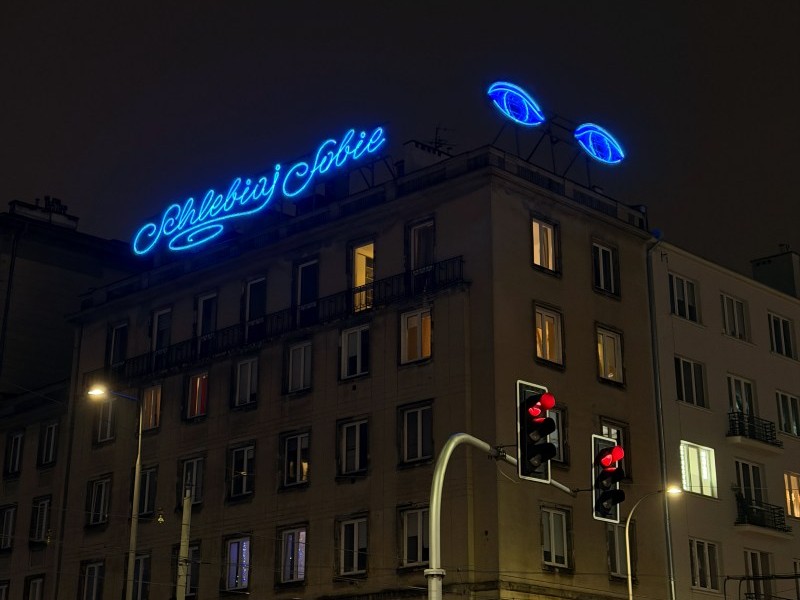 Punktem wyjścia dla projektu była gra słów. Hasło „Schlebiaj Sobie” łączy codzienność pieczywa z ideą sprawiania sobie przyjemności jako prostego, ciepłego gestu skierowanego do mieszkańców i przechodniów. Typografię uzupełniają dwa stylizowane, mrugające oczy, które wprowadzają ruch i rytm, sprawiając, że neon naturalnie wchodzi w dialog z miastem.