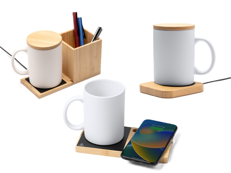 Innowacyjny organizer na długopisy ze składanym podgrzewaczem do kubków, wykonany z bambusa. Idealny do utrzymywania temperatury w napoju, jednocześnie organizując przybory na biurku. Zawiera 1-metrowy kabel z wyjściami USB i USB C.