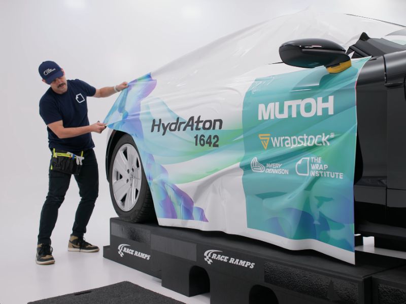 Test przeprowadzony przez The Wrap Institute miał podwójnie ekologiczny wymiar. Mutoh udowodnił już wcześniej, że atramenty AQUAFUZE™ potrafią współpracować z wymagającymi foliami wylewanymi (co potwierdziła oficjalna certyfikacja we współpracy z producentem folii Grafityp/Omega Skinz). Tym razem, do oklejenia Porsche użyto folii premium bez zawartości PVC od Avery Dennison dodatkowo zabezpieczonej połyskowym laminatem.