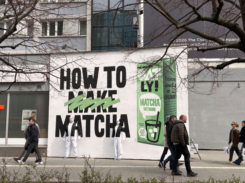 Aktywacja opierała się na niestandardowym samplingu – przechodnie mogli spróbować matchy Oatly w zaskakującej, nieoczywistej formie, wpisującej się w charakter ulicznego i ambientowego doświadczenia. Celem było przełamanie schematu klasycznej degustacji i stworzenie angażującego momentu, który naturalnie przyciągał uwagę oraz zachęcał do interakcji z marką. Oatly, znane globalnie z odważnej, humorystycznej i nieszablonowej komunikacji outdoorowej, konsekwentnie buduje swój wizerunek poprzez działania, które wykraczają poza standardowe formaty. Ta aktywacja była rozwinięciem tego podejścia, zaprojektowana tak, by bawić i jednocześnie zaskakiwać odbiorców w codziennym otoczeniu.